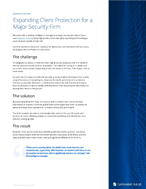 Dataminr’s AI platform delivers the earliest warnings on high impact events and critical information far in advance of other sources.